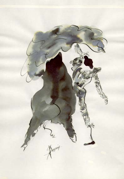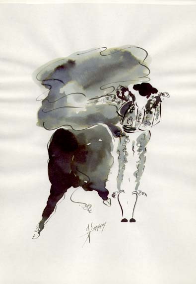 C’est à l’âge de 16 ans que Gérard Simonin assista à sa première corrida à Madrid. Pour lui se fut, dit-il, » une impression intense et lourde dans le combat de l’homme et du toro où la vie et la mort se transcendent dans une même foi. » Son jugement n’a guère varié : tout au plus a-t-il mis plus ou moins d’or dans l’habit de lumière du torero et plus ou moins de noir dans la parure du toro.