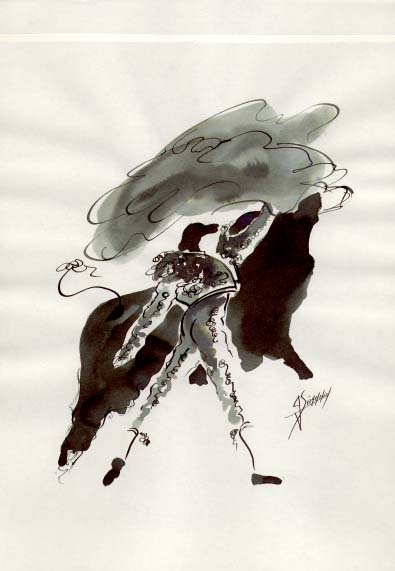 Dès 1995, son aficion jusque-là restée inexistante dans son travail commence à apparaître. Alors il « attaque » ses toiles comme s’il entrait dans l’arène, se laisse éclabousser par la lumière et nous la restitue dans une peinture aux couleurs franches, avec la même finalité sincère que le maestro. Sa peinture est un hymne à la gestuelle, à la danse du toro, mais surtout un magnifique hommage au toro.